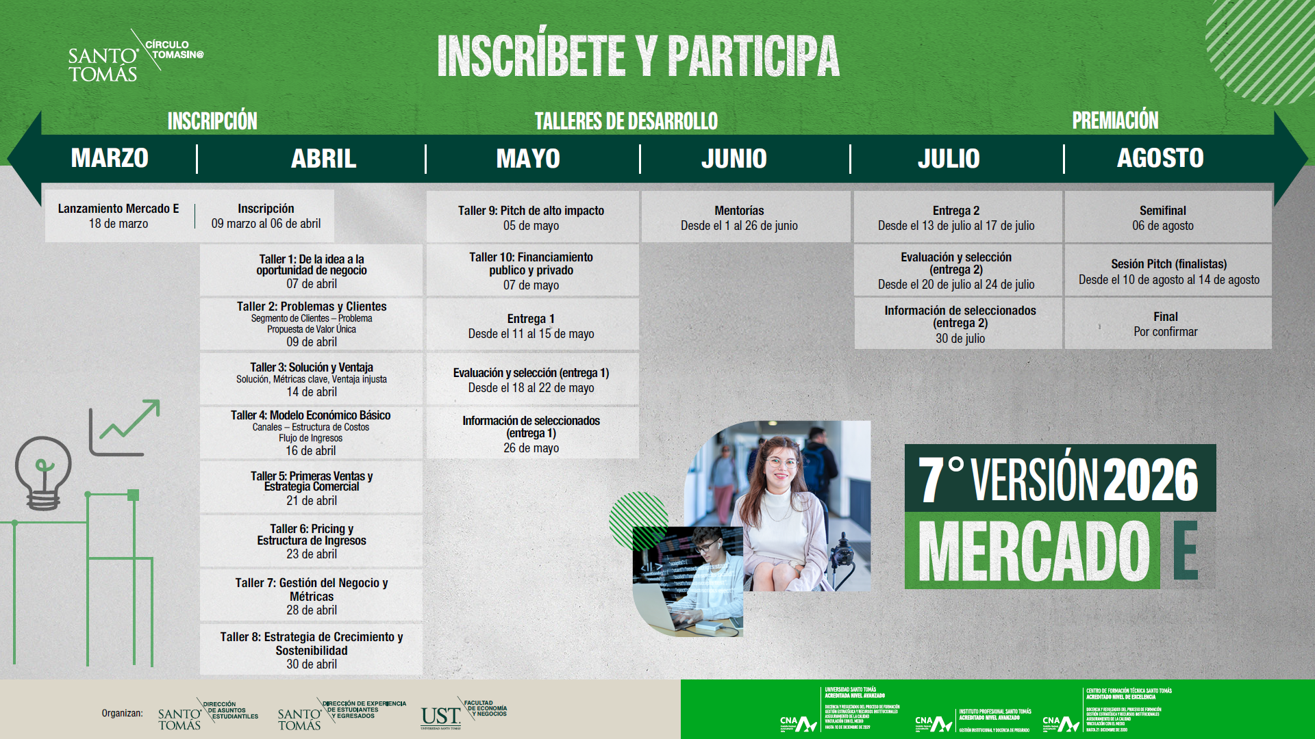 El Programa de Emprendimiento e Innovación Mercado E es una iniciativa del área de la Dirección de Experiencia de Estudiantes y Egresados y la Dirección de Asuntos Estudiantiles (DAE), que apoya a estudiantes y egresados/as de Santo Tomás a impulsar su emprendimiento o idea de negocio.