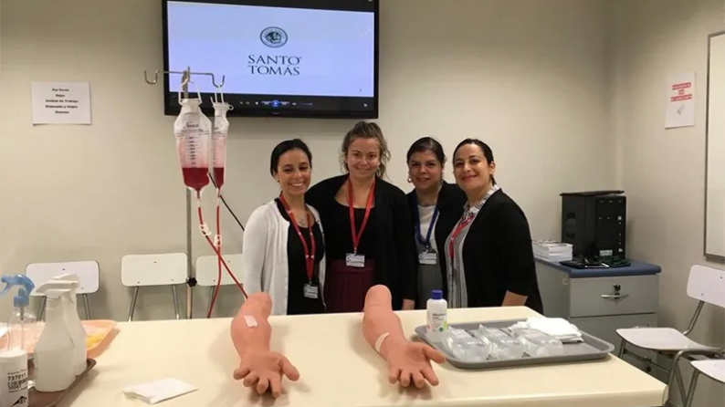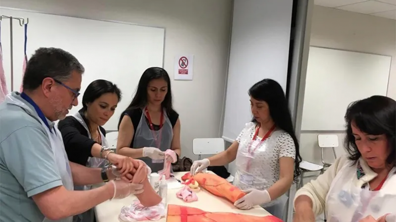Las Coordinadoras de Simulación Maria Dolores Jaramillo, Aracelly Moreno, María José Cifuentes y Claudia Palma, fueron las encargadas de desarrollar un taller práctico donde los participantes al congreso tuvieron la oportunidad de realizar los cuidados de mantención; limpieza y recambio de estructuras de un brazo para punción venosa y arterial.