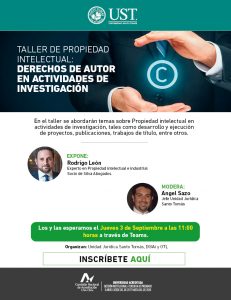 Con el objetivo de fomentar el conocimiento en materia de propiedad intelectual, la Unidad Jurídica Santo Tomás organizó con el apoyo de la OTL de la Dirección General de Investigación Aplicada e innovación UST, un Taller de Derechos de Autor en donde se abordaron temas sobre Propiedad intelectual en actividades de investigación, tales como desarrollo y ejecución de proyectos, publicaciones, trabajos de título, entre otros.