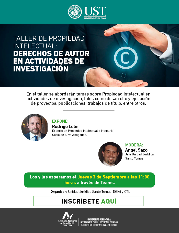 El taller fue Moderado por Ángel Sazo Reyes, Jefe Unidad Jurídica, Santo Tomás y dictado por Rodrigo León Urrutia, Experto en Propiedad intelectual e industrial, Socio de Silva Abogados. Especialista en regulación empresarial y universitaria de la innovación y propiedad intelectual, ha elaborado las políticas y reglamentos de propiedad intelectual de las principales universidades y empresas de Chile.