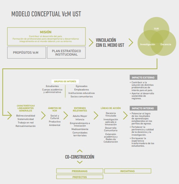 El Modelo Conceptual de Vinculación con el Medio de la Universidad Santo Tomás, en primer lugar, establece la interrelación entre las tres funciones misionales: docencia, investigación y vinculación con el medio. Para la UST, esta última tributa a las misiones de docencia de pregrado y postgrado e investigación. Es decir, debe contribuir a la pertinencia y calidad de las otras dos funciones misionales y se debe priorizar la realización de este tipo de vinculación, especialmente en el espacio donde converge y existe intersección con las otras funciones.